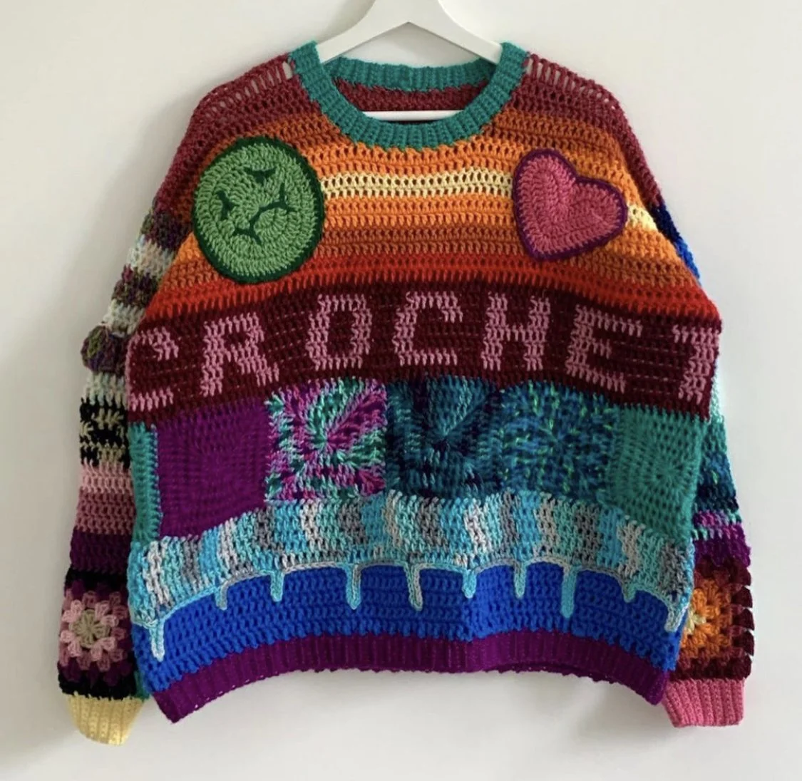 A master of crocheted sweaters and sweater vests, @kid.crochet is also a colorful crochet artist who at times uses patches and crocheted motifs to create a visceral experience of crochet garments. The pieces stand out, almost as if coming out of the screen with its array of bold color and fascinating motifs. Inventive, statement pieces that are unapologetic about experimenting with color and texture. The feed also features several menswear and amigurumi crocheted pieces.