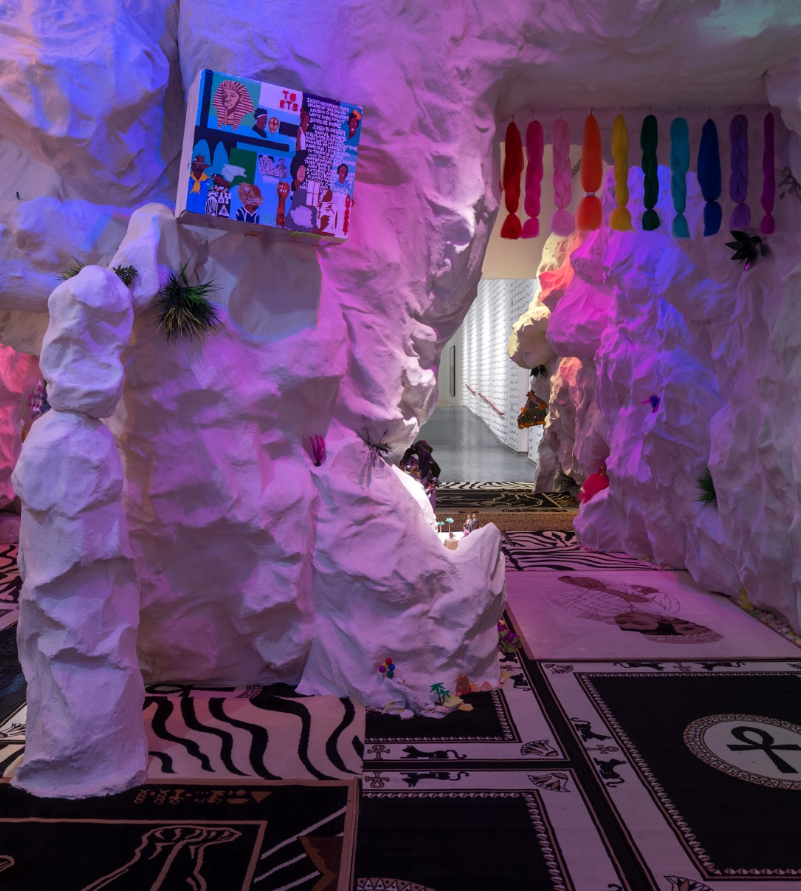 This summer, artist in residence Lauren Halsey has taken over MOCA Grand’s galleries with her site-specific installation piece, “We Still Here, There”. From March through September, Halsey’s otherworldly, funk-infused, afrofuturist system of caves and grottos will supplant MOCA’s traditional white-cube display. In a powerful artistic reversal of the forces of gentrification, the cultural aesthetics of South Central have invaded the institutional and exclusive space of the museum, located in the trendy neighborhood of Downtown LA.