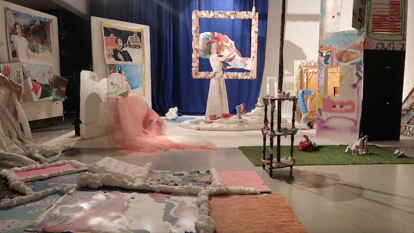 For my third year diploma show I created a musical theatre piece about a girl stuck inside a giant framed painting I suspended from the ceiling. She is carrying a large, human sized shell on her shoulders and the beach is projected behind her. Through out the performance she is looking out on a whimsical installation and the other performers who are dancing, singing, taking selfies —but she can not participate. The opening lines are “This is the frame in which I exist and in which I see and experience the world. From here, I can see everything. But can touch nothing. I can hear, but I can not be heard. If only I could make it to the other side, I could be the protagonist in my own life.” At the end, she switches places with the performers, but from the other side she sees it is not as great as it looked from the outside looking in. This performance is about how social media and Instagram in particular can make us feel like we are missing out, and that the identity we curate online in these square grids can take a precedent over real, human connection. The shell was a metaphor for the feelings of heaviness this pressure can put upon us. The performance was really quite funny and light hearted—I like to take current issues and explore them through satire.
