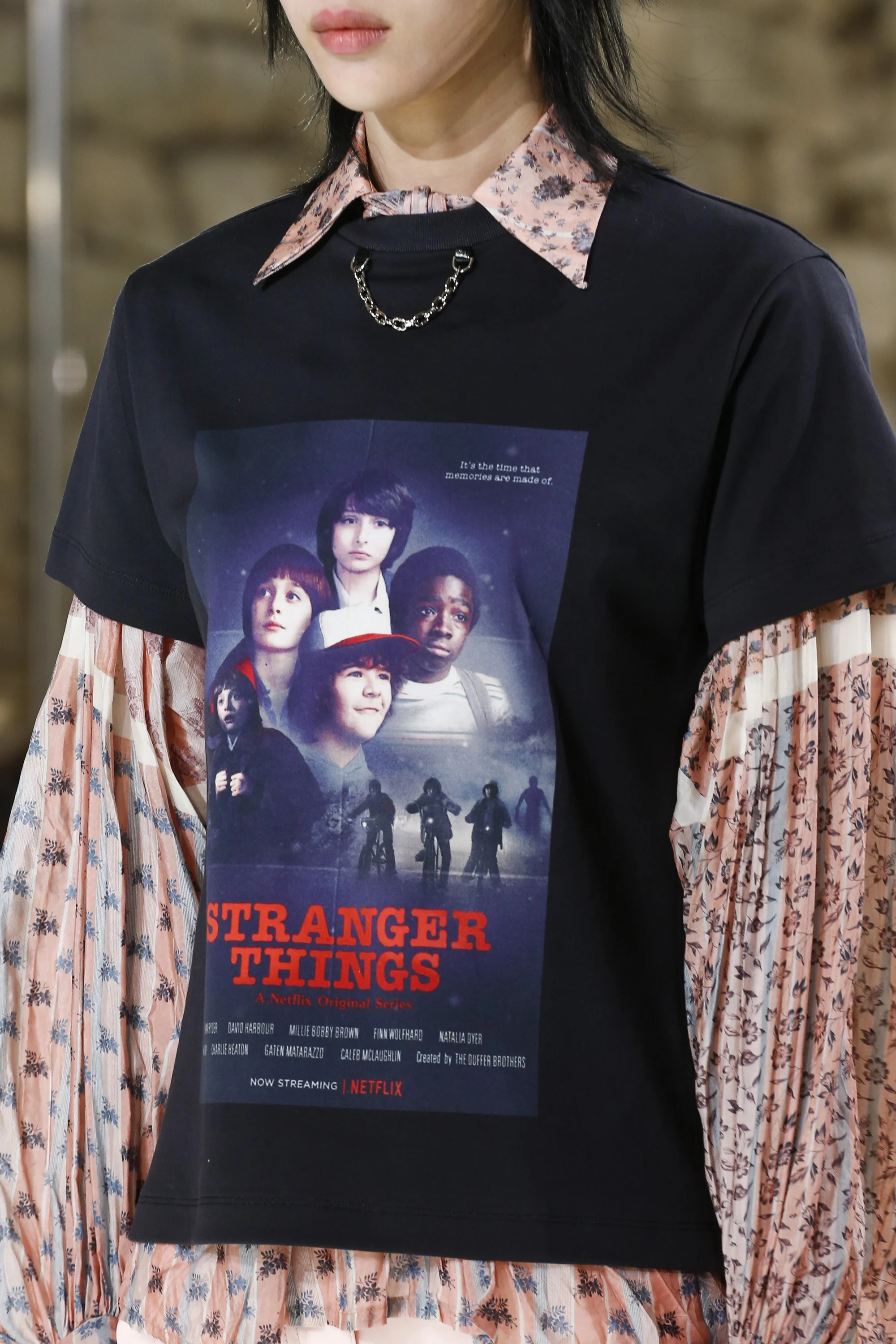 Nicolas Ghesquière took Louis Vuitton on to a Marie Antoinette-goes-grunge journey for the Spring/Summer 2018 collection, which took place at the Louvre’s Pavillon de l’Horlog. With elaborate stone walls as fortresses, the runway procession took on the theme of the Netflix hit Stranger Things, at least that's what the music eluded to as well as the infamous t-shirt merch. It definitely got our attention and has gone viral in itself, but the collection reveled in brocade costumery and sportswear influences. How happy were the models to close out Paris Fashion Week in sneakers? Watch the full show below.